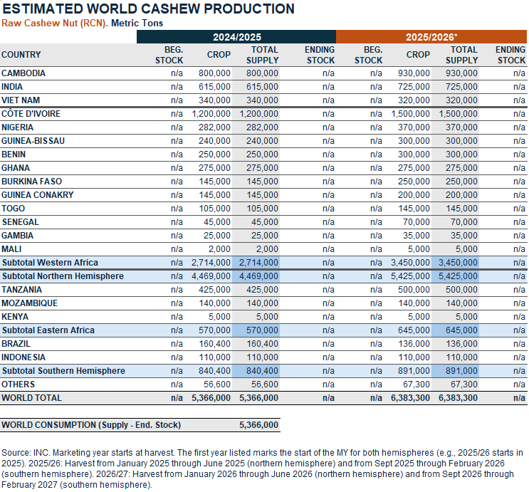 With the Northern Hemisphere 2025/26 crops largely delivered by the end of 2025, most estimates have been reassessed upwards since the last update. Southern Hemisphere crops are estimated 13% up from the previous season, led by Tanzania, up over 18% from 2024/25. In Brazil, while the 2024/25 crop delivered the strongest output in recent years, the 2025/26 crop has been unexpectedly weak. Overall, the 2025/26 crop, at approximately 6.4 million metric tons of raw cashew nuts, marks a historical high.