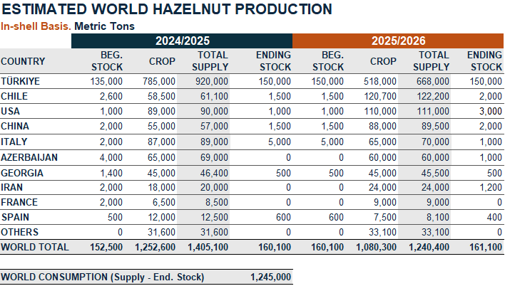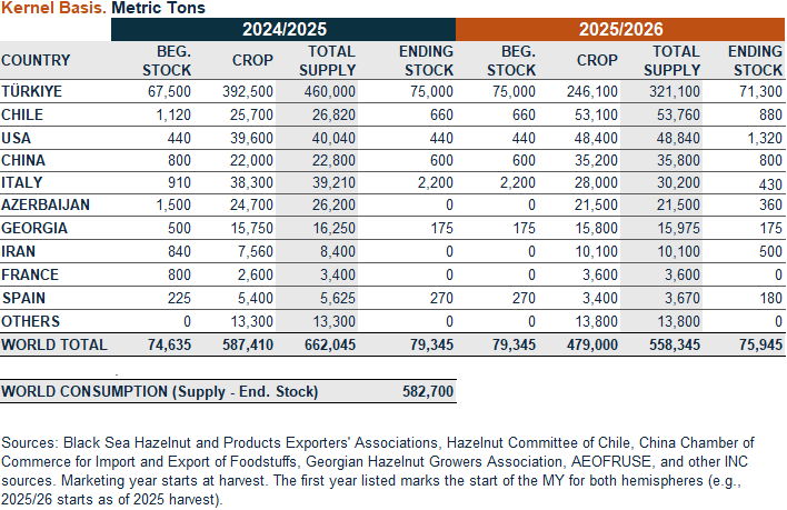 Türkiye. As per the Black Sea Hazelnut Exporters’ Associations post-harvest assessments, the 2025/26 crop is estimated at 528,000 metric tons in-shell, with kernel yields around 47-48%, and potentially 518,000 MT after additional de-husking losses. Quality is variable, with a larger share of small calibers. At the time of reporting, supply was expected to remain adequate, supported by carryover, stronger outputs in other origins and softer demand.